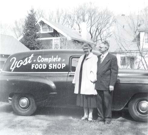 Chuck and Peggy Yost in front of their Yost Food Shop van in 1956(?).